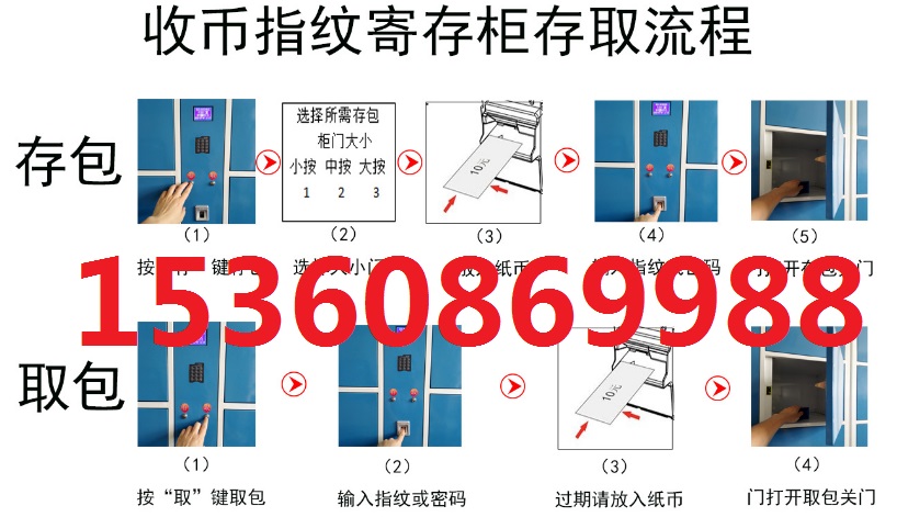 存包:按存键—选择大小门—输入纸币—按指纹开门---存放东西—关门